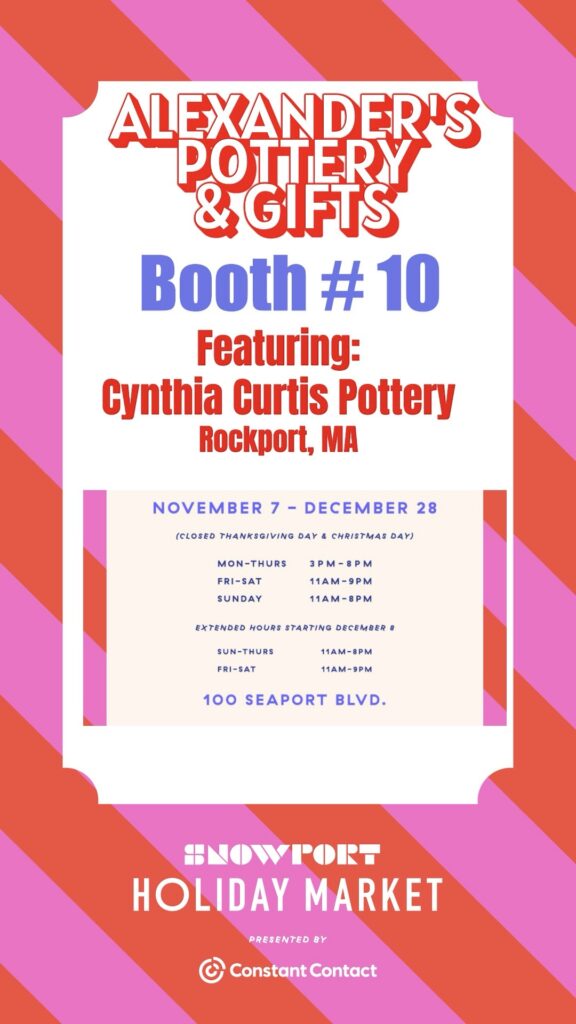 Snowport!. New this year! Alexander’s Pottery on Bearskin Neck will be one of 130 vendors at this year’s Snowport Holiday Market, featuring over five hundred of my pieces! 100 Seaport Blvd. Boston. Free admission!